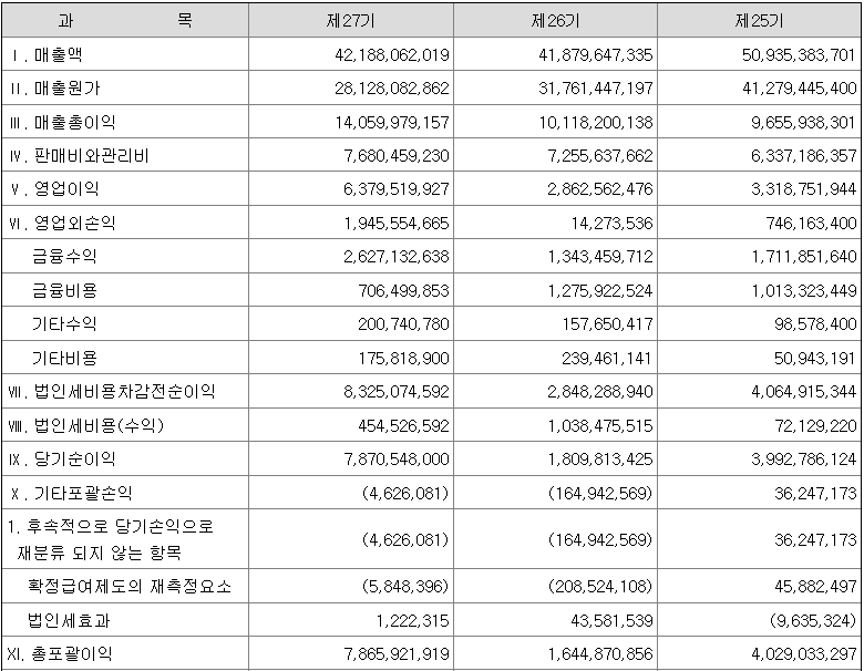 매출은 약간 증가했고, 매출원가는 감소하여 매출총이익과 영업이익이 개선되었습니다. 또한 영업외손익이 크게 증가하면서 당기순이익도 크게 증가한 해였습니다.