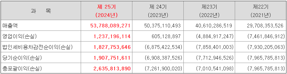 ✔️ 3. 당기순이익: 3년 적자에서 2024년 흑자 전환